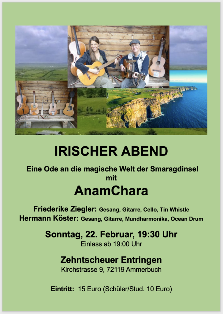 Friederike Ziegler und Hermann Köster nahmen ihr Publikum am 22. Februar 2026 mit auf eine Reise in die zauberhafte Klangwelt Irlands – mit Gesang und Gedichten, mit Gitarren, Cello, Tin Whistles, Mundharmonikas und Ocean Drum, und mit Bildern.