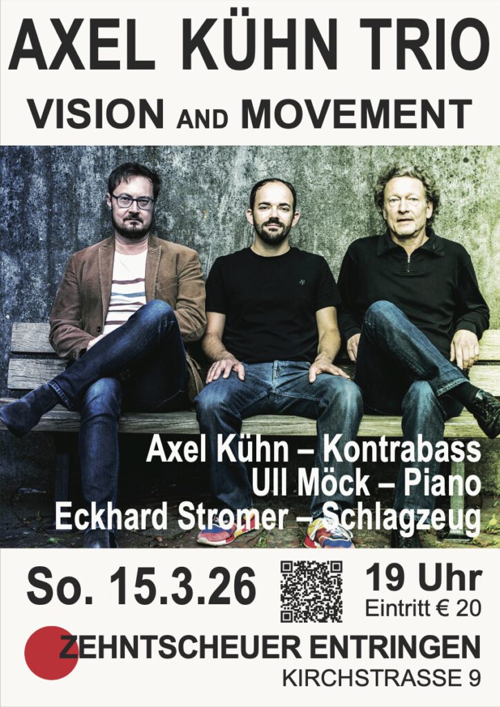 So stand es in der Ankündigung und genau dies erwartete die Besucher des Jazzkonzertes am 15. März 2026 in der Zehntscheuer. Das Axel Kühn Trio stellte sein fünftes Album „Vision and Movement live at Bix“ vor. Auch ausgesuchte Stücke aus früheren Alben wurden präsentiert, alles Eigenkompositionen aus der Feder des preisgekrönten Bassisten Axel Kühn. In seiner Moderation bot er kleine Einblicke in die Entstehung der Kompositionen. So kam das Publikum in den Genuss eines äußerst unterhaltsamen und abwechslungsreichen Programms.